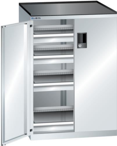 "longDescription": "LISTA Schubladenschrank mit Flügeltüren, Lista Einheit: 36x27E, BxTxH: 717x600x1020mm, Schubladen-Nutzfläche BxT: 612x459mm, Anzahl Schubladen: 4x75mm (75kg), Schliessart: Code Lock, elektronisches Zahlenschloss mit 10 Ziffern für 4- bis 6-stellige Codes, bis 100 Codes, Ausstattung: Abrollrand 3-seitig, 20mm hoch, inklusive Rillenmatte, Farbe Gehäuse: Lichtgrau RAL 7035, Farbe Türen/Schubladen: Lichtgrau RAL 7035. Allgemeine Vorteile der LISTA Schubladenschränke. Ideal für grosses und schweres Lagergut bis 200 kg pro Schublade mit Auszugböden zur flächenbündigen Lagerung. Jederzeit anpassbar an neues Lagergut durch den flexiblen Ein- und Umbau von Schubladen, Auszugböden und Verstellböden im 25-mm-Raster. Einfaches Versetzen mittels Hubwagen dank Staplersockel auch bei beladenem Schrank<br>",