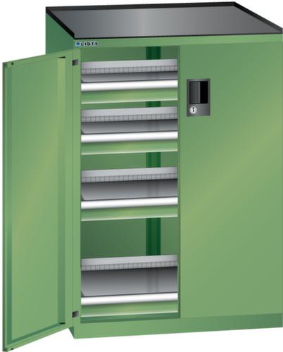 "longDescription": "LISTA Schubladenschrank mit Flügeltüren, Lista Einheit: 36x27E, BxTxH: 717x600x1020mm, Schubladen-Nutzfläche BxT: 612x459mm, Anzahl Schubladen: 4x75mm (75kg), Schliessart: Code Lock, elektronisches Zahlenschloss mit 10 Ziffern für 4- bis 6-stellige Codes, bis 100 Codes, Ausstattung: Abrollrand 3-seitig, 20mm hoch, inklusive Rillenmatte, Farbe Gehäuse: Resedagrün RAL 6011, Farbe Türen/Schubladen: Resedagrün RAL 6011. Allgemeine Vorteile der LISTA Schubladenschränke. Ideal für grosses und schweres Lagergut bis 200 kg pro Schublade mit Auszugböden zur flächenbündigen Lagerung. Jederzeit anpassbar an neues Lagergut durch den flexiblen Ein- und Umbau von Schubladen, Auszugböden und Verstellböden im 25-mm-Raster. Einfaches Versetzen mittels Hubwagen dank Staplersockel auch bei beladenem Schrank<br>",