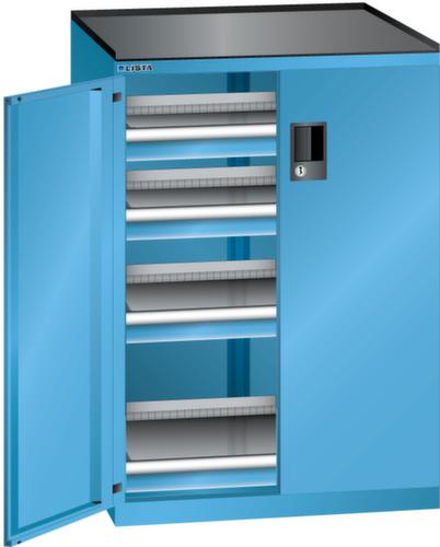 "longDescription": "LISTA Schubladenschrank mit Flügeltüren, Lista Einheit: 36x27E, BxTxH: 717x600x1020mm, Schubladen-Nutzfläche BxT: 612x459mm, Anzahl Schubladen: 4x75mm (200kg), Schliessart: Key Lock, Standard-Schliessung mit Wechselzylinder inkl. 2 Schlüsseln mit Schlüsselnummer, Ausstattung: Abrollrand 3-seitig, 20mm hoch, inklusive Rillenmatte, Farbe Gehäuse: Lichtblau RAL 5012, Farbe Türen/Schubladen: Lichtblau RAL 5012. Allgemeine Vorteile der LISTA Schubladenschränke. Ideal für grosses und schweres Lagergut bis 200 kg pro Schublade mit Auszugböden zur flächenbündigen Lagerung. Jederzeit anpassbar an neues Lagergut durch den flexiblen Ein- und Umbau von Schubladen, Auszugböden und Verstellböden im 25-mm-Raster. Einfaches Versetzen mittels Hubwagen dank Staplersockel auch bei beladenem Schrank<br>",