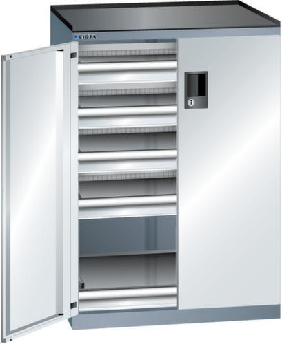 "longDescription": "LISTA Schubladenschrank mit Flügeltüren, Lista Einheit: 36x27E, BxTxH: 717x600x1020mm, Schubladen-Nutzfläche BxT: 612x459mm, Anzahl Schubladen: 5x75mm (75kg), Schliessart: Code Lock, elektronisches Zahlenschloss mit 10 Ziffern für 4- bis 6-stellige Codes, bis 100 Codes, Ausstattung: Abrollrand 3-seitig, 20mm hoch, inklusive Rillenmatte, Farbe Gehäuse: Grau metallic NCS S 6502-B, Farbe Türen/Schubladen: Lichtgrau RAL 7035. Allgemeine Vorteile der LISTA Schubladenschränke. Ideal für grosses und schweres Lagergut bis 200 kg pro Schublade mit Auszugböden zur flächenbündigen Lagerung. Jederzeit anpassbar an neues Lagergut durch den flexiblen Ein- und Umbau von Schubladen, Auszugböden und Verstellböden im 25-mm-Raster. Einfaches Versetzen mittels Hubwagen dank Staplersockel auch bei beladenem Schrank<br>",