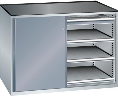 "longDescription": "LISTA Schubladenschrank mit Schiebetüren, Lista Einheit: 2 x 36x27E, BxTxH: 1430x627x1020mm, Schubladen-Nutzfläche BxT: 612x459mm, Anzahl Schubladen: 2x75mm (75kg), Anzahl Auszugböden: 6x75mm (75kg), Schliessart: Key Lock, Standard-Schliessung mit Wechselzylinder inkl. 2 Schlüsseln mit Schlüsselnummer, Ausstattung: Abrollrand 3-seitig, 20mm hoch, inklusive Rillenmatte, Farbe Gehäuse: Lichtgrau RAL 7035, Farbe Türen/Schubladen: Grau metallic NCS S 6502-B. Allgemeine Vorteile der LISTA Schubladenschränke. Ideal für grosses und schweres Lagergut bis 200 kg pro Schublade mit Auszugböden zur flächenbündigen Lagerung. Jederzeit anpassbar an neues Lagergut durch den flexiblen Ein- und Umbau von Schubladen, Auszugböden und Verstellböden im 25-mm-Raster. Einfaches Versetzen mittels Hubwagen dank Staplersockel auch bei beladenem Schrank<br>",