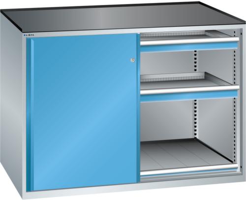 "longDescription": "LISTA Schubladenschrank mit Schiebetüren, Lista Einheit: 2 x 36x27E, BxTxH: 1430x627x1020mm, Schubladen-Nutzfläche BxT: 612x459mm, Anzahl Schubladen: 4x75mm (75kg), Anzahl Auszugböden: 2x75mm (75kg), Schliessart: Key Lock, Standard-Schliessung mit Wechselzylinder inkl. 2 Schlüsseln mit Schlüsselnummer, Ausstattung: Abrollrand 3-seitig, 20mm hoch, inklusive Rillenmatte, Farbe Gehäuse: Lichtgrau RAL 7035, Farbe Türen/Schubladen: Lichtblau RAL 5012. Allgemeine Vorteile der LISTA Schubladenschränke. Ideal für grosses und schweres Lagergut bis 200 kg pro Schublade mit Auszugböden zur flächenbündigen Lagerung. Jederzeit anpassbar an neues Lagergut durch den flexiblen Ein- und Umbau von Schubladen, Auszugböden und Verstellböden im 25-mm-Raster. Einfaches Versetzen mittels Hubwagen dank Staplersockel auch bei beladenem Schrank<br>",