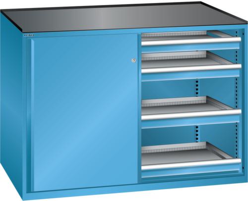"longDescription": "LISTA Schubladenschrank mit Schiebetüren, Lista Einheit: 2 x 36x27E, BxTxH: 1430x627x1020mm, Schubladen-Nutzfläche BxT: 612x459mm, Anzahl Schubladen: 8x75mm (75kg), Schliessart: Key Lock, Standard-Schliessung mit Wechselzylinder inkl. 2 Schlüsseln mit Schlüsselnummer, Ausstattung: Abrollrand 3-seitig, 20mm hoch, inklusive Rillenmatte, Farbe Gehäuse: Lichtblau RAL 5012, Farbe Türen/Schubladen: Lichtblau RAL 5012. Allgemeine Vorteile der LISTA Schubladenschränke. Ideal für grosses und schweres Lagergut bis 200 kg pro Schublade mit Auszugböden zur flächenbündigen Lagerung. Jederzeit anpassbar an neues Lagergut durch den flexiblen Ein- und Umbau von Schubladen, Auszugböden und Verstellböden im 25-mm-Raster. Einfaches Versetzen mittels Hubwagen dank Staplersockel auch bei beladenem Schrank<br>",