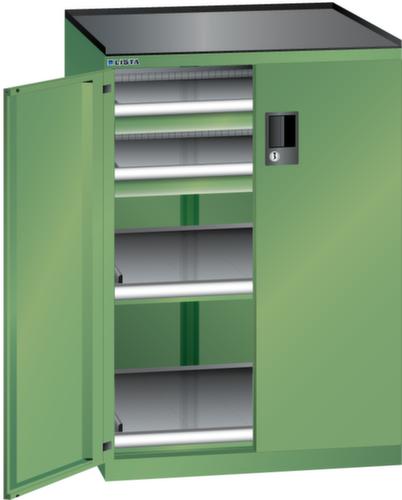 "longDescription": "LISTA Schubladenschrank mit Flügeltüren, Lista Einheit: 36x36E, BxTxH: 717x753x1020mm, Schubladen-Nutzfläche BxT: 612x612mm, Anzahl Schubladen: 2x75mm (200kg), Anzahl Auszugböden: 2x75mm (200kg), Schliessart: Code Lock, elektronisches Zahlenschloss mit 10 Ziffern für 4- bis 6-stellige Codes, bis 100 Codes, Ausstattung: Abrollrand 3-seitig, 20mm hoch, inklusive Rillenmatte, Farbe Gehäuse: Resedagrün RAL 6011, Farbe Türen/Schubladen: Resedagrün RAL 6011. Allgemeine Vorteile der LISTA Schubladenschränke. Ideal für grosses und schweres Lagergut bis 200 kg pro Schublade mit Auszugböden zur flächenbündigen Lagerung. Jederzeit anpassbar an neues Lagergut durch den flexiblen Ein- und Umbau von Schubladen, Auszugböden und Verstellböden im 25-mm-Raster. Einfaches Versetzen mittels Hubwagen dank Staplersockel auch bei beladenem Schrank<br>",