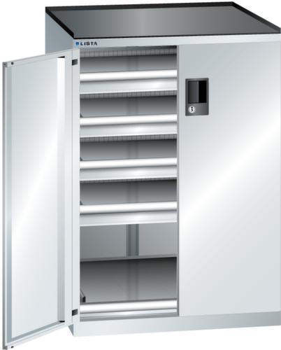 "longDescription": "LISTA Schubladenschrank mit Flügeltüren, Lista Einheit: 36x36E, BxTxH: 717x753x1020mm, Schubladen-Nutzfläche BxT: 612x612mm, Anzahl Schubladen: 4x75mm (200kg), Anzahl Auszugböden: 1x75mm (200kg), Schliessart: Key Lock, Standard-Schliessung mit Wechselzylinder inkl. 2 Schlüsseln mit Schlüsselnummer, Ausstattung: Abrollrand 3-seitig, 20mm hoch, inklusive Rillenmatte, Farbe Gehäuse: Lichtgrau RAL 7035, Farbe Türen/Schubladen: Lichtgrau RAL 7035. Allgemeine Vorteile der LISTA Schubladenschränke. Ideal für grosses und schweres Lagergut bis 200 kg pro Schublade mit Auszugböden zur flächenbündigen Lagerung. Jederzeit anpassbar an neues Lagergut durch den flexiblen Ein- und Umbau von Schubladen, Auszugböden und Verstellböden im 25-mm-Raster. Einfaches Versetzen mittels Hubwagen dank Staplersockel auch bei beladenem Schrank<br>",