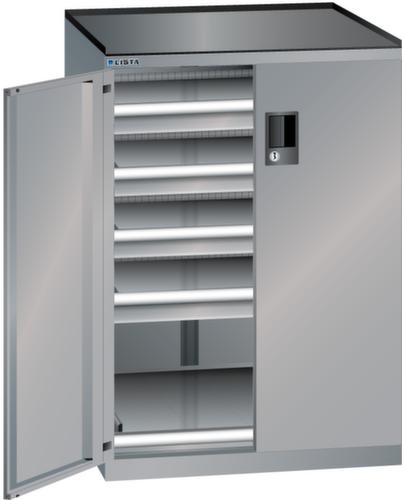 "longDescription": "LISTA Schubladenschrank mit Flügeltüren, Lista Einheit: 36x36E, BxTxH: 717x753x1020mm, Schubladen-Nutzfläche BxT: 612x612mm, Anzahl Schubladen: 4x75mm (200kg), Anzahl Auszugböden: 1x75mm (200kg), Schliessart: Code Lock, elektronisches Zahlenschloss mit 10 Ziffern für 4- bis 6-stellige Codes, bis 100 Codes, Ausstattung: Abrollrand 3-seitig, 20mm hoch, inklusive Rillenmatte, Farbe Gehäuse: Taubengrau NCS S 4502-B, Farbe Türen/Schubladen: Taubengrau NCS S 4502-B. Allgemeine Vorteile der LISTA Schubladenschränke. Ideal für grosses und schweres Lagergut bis 200 kg pro Schublade mit Auszugböden zur flächenbündigen Lagerung. Jederzeit anpassbar an neues Lagergut durch den flexiblen Ein- und Umbau von Schubladen, Auszugböden und Verstellböden im 25-mm-Raster. Einfaches Versetzen mittels Hubwagen dank Staplersockel auch bei beladenem Schrank<br>",