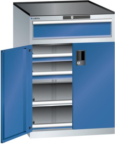 "longDescription": "LISTA Schubladenschrank mit Flügeltüren, Lista Einheit: 36x36E, BxTxH: 717x753x1020mm, Schubladen-Nutzfläche BxT: 612x612mm, Anzahl Schubladen: oben: 1x150mm (75kg), unten: 2x75mm (75kg), Anzahl Auszugböden: 2x75mm (75kg), Schliessart: Code Lock, elektronisches Zahlenschloss mit 10 Ziffern für 4- bis 6-stellige Codes, bis 100 Codes, Ausstattung: Abrollrand 3-seitig, 20mm hoch, inklusive Rillenmatte, Farbe Gehäuse: Lichtgrau RAL 7035, Farbe Türen/Schubladen: Signalblau RAL 5005. Allgemeine Vorteile der LISTA Schubladenschränke. Ideal für grosses und schweres Lagergut bis 200 kg pro Schublade mit Auszugböden zur flächenbündigen Lagerung. Jederzeit anpassbar an neues Lagergut durch den flexiblen Ein- und Umbau von Schubladen, Auszugböden und Verstellböden im 25-mm-Raster. Einfaches Versetzen mittels Hubwagen dank Staplersockel auch bei beladenem Schrank<br>",