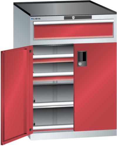 "longDescription": "LISTA Schubladenschrank mit Flügeltüren, Lista Einheit: 36x36E, BxTxH: 717x753x1020mm, Schubladen-Nutzfläche BxT: 612x612mm, Anzahl Schubladen: oben: 1x150mm (75kg), unten: 2x75mm (75kg), Anzahl Auszugböden: 2x75mm (75kg), Schliessart: Code Lock, elektronisches Zahlenschloss mit 10 Ziffern für 4- bis 6-stellige Codes, bis 100 Codes, Ausstattung: Abrollrand 3-seitig, 20mm hoch, inklusive Rillenmatte, Farbe Gehäuse: Lichtgrau RAL 7035, Farbe Türen/Schubladen: Rubinrot RAL 3003. Allgemeine Vorteile der LISTA Schubladenschränke. Ideal für grosses und schweres Lagergut bis 200 kg pro Schublade mit Auszugböden zur flächenbündigen Lagerung. Jederzeit anpassbar an neues Lagergut durch den flexiblen Ein- und Umbau von Schubladen, Auszugböden und Verstellböden im 25-mm-Raster. Einfaches Versetzen mittels Hubwagen dank Staplersockel auch bei beladenem Schrank<br>",