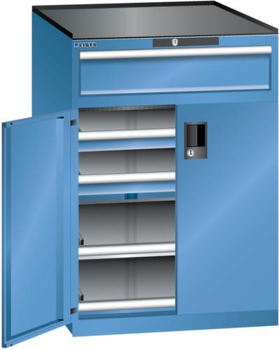 "longDescription": "LISTA Schubladenschrank mit Flügeltüren, Lista Einheit: 36x36E, BxTxH: 717x753x1020mm, Schubladen-Nutzfläche BxT: 612x612mm, Anzahl Schubladen: oben: 1x150mm (200kg), unten: 2x75mm (200kg), Anzahl Auszugböden: 2x75mm (200kg), Schliessart: Code Lock, elektronisches Zahlenschloss mit 10 Ziffern für 4- bis 6-stellige Codes, bis 100 Codes, Ausstattung: Abrollrand 3-seitig, 20mm hoch, inklusive Rillenmatte, Farbe Gehäuse: Capriblau RAL 5019, Farbe Türen/Schubladen: Capriblau RAL 5019. Allgemeine Vorteile der LISTA Schubladenschränke. Ideal für grosses und schweres Lagergut bis 200 kg pro Schublade mit Auszugböden zur flächenbündigen Lagerung. Jederzeit anpassbar an neues Lagergut durch den flexiblen Ein- und Umbau von Schubladen, Auszugböden und Verstellböden im 25-mm-Raster. Einfaches Versetzen mittels Hubwagen dank Staplersockel auch bei beladenem Schrank<br>",