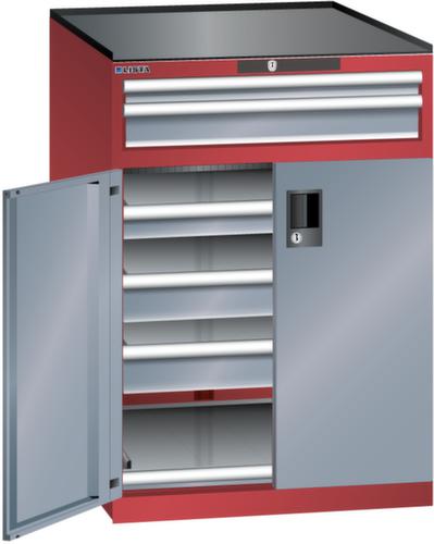 "longDescription": "LISTA Schubladenschrank mit Flügeltüren, Lista Einheit: 36x36E, BxTxH: 717x753x1020mm, Schubladen-Nutzfläche BxT: 612x612mm, Anzahl Schubladen: oben: 1x50mm (75kg), 1x100mm (75kg), unten: 1x75mm (75kg), 2x100mm (75kg), Anzahl Auszugböden: 1x75mm (75kg), Schliessart: Code Lock, elektronisches Zahlenschloss mit 10 Ziffern für 4- bis 6-stellige Codes, bis 100 Codes, Ausstattung: Abrollrand 3-seitig, 20mm hoch, inklusive Rillenmatte, Farbe Gehäuse: Rubinrot RAL 3003, Farbe Türen/Schubladen: Grau metallic NCS S 6502-B. Allgemeine Vorteile der LISTA Schubladenschränke. Ideal für grosses und schweres Lagergut bis 200 kg pro Schublade mit Auszugböden zur flächenbündigen Lagerung. Jederzeit anpassbar an neues Lagergut durch den flexiblen Ein- und Umbau von Schubladen, Auszugböden und Verstellböden im 25-mm-Raster. Einfaches Versetzen mittels Hubwagen dank Staplersockel auch bei beladenem Schrank<br>",