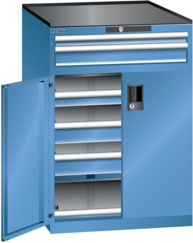 "longDescription": "LISTA Schubladenschrank mit Flügeltüren, Lista Einheit: 36x36E, BxTxH: 717x753x1020mm, Schubladen-Nutzfläche BxT: 612x612mm, Anzahl Schubladen: oben: 1x50mm (200kg), 1x100mm (200kg), unten: 1x75mm (200kg), 2x100mm (200kg), Anzahl Auszugböden: 1x75mm (200kg), Schliessart: Code Lock, elektronisches Zahlenschloss mit 10 Ziffern für 4- bis 6-stellige Codes, bis 100 Codes, Ausstattung: Abrollrand 3-seitig, 20mm hoch, inklusive Rillenmatte, Farbe Gehäuse: Capriblau RAL 5019, Farbe Türen/Schubladen: Capriblau RAL 5019. Allgemeine Vorteile der LISTA Schubladenschränke. Ideal für grosses und schweres Lagergut bis 200 kg pro Schublade mit Auszugböden zur flächenbündigen Lagerung. Jederzeit anpassbar an neues Lagergut durch den flexiblen Ein- und Umbau von Schubladen, Auszugböden und Verstellböden im 25-mm-Raster. Einfaches Versetzen mittels Hubwagen dank Staplersockel auch bei beladenem Schrank<br>",