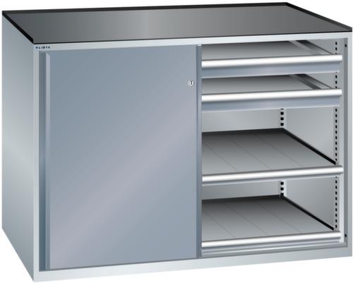 "longDescription": "LISTA Schubladenschrank mit Schiebetüren, Lista Einheit: 2 x 36x36E, BxTxH: 1430x780x1020mm, Schubladen-Nutzfläche BxT: 612x612mm, Anzahl Schubladen: 4x75mm (200kg), Anzahl Auszugböden: 4x75mm (200kg), Schliessart: Key Lock, Standard-Schliessung mit Wechselzylinder inkl. 2 Schlüsseln mit Schlüsselnummer, Ausstattung: Abrollrand 3-seitig, 20mm hoch, inklusive Rillenmatte, Farbe Gehäuse: Lichtgrau RAL 7035, Farbe Türen/Schubladen: Grau metallic NCS S 6502-B. Allgemeine Vorteile der LISTA Schubladenschränke. Ideal für grosses und schweres Lagergut bis 200 kg pro Schublade mit Auszugböden zur flächenbündigen Lagerung. Jederzeit anpassbar an neues Lagergut durch den flexiblen Ein- und Umbau von Schubladen, Auszugböden und Verstellböden im 25-mm-Raster. Einfaches Versetzen mittels Hubwagen dank Staplersockel auch bei beladenem Schrank<br>",