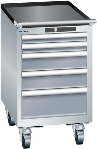 "longDescription": "LISTA Schubladenschrank mobil, Lista Einheit: 18x27E, BxTxH: 411x572x723mm, Schubladen-Nutzfläche BxT: 306x459mm, Anzahl Schubladen: 5, Anzahl Fronthöhen (Tragkraft): 2x50mm (75kg), 2x100mm (75kg), 1x150mm (75kg), Schliessart: Key Lock, Standard-Schliessung mit Wechselyzlinder inkl. 2 Schlüsseln mit Schlüsselnummer, Farbe Gehäuse: Lichtgrau RAL 7035, Farbe Schubladen: Grau metallic NCS S 6502-B. Höchste Stabilität: Gehäuse bis 4t belastbar, Schubladen mit 75 oder 200 kg Tragkraft. Maximale Ausnutzung dank Vollauszug und optimaler Mantelhöhe der Schubladen. Exzellente Schutzeigenschaften gegen Schmutz, Flüssigkeiten und mechanische Beanspruchung durch geschlossenes Gehäuse mit schlag- und abriebfester Oberfläche. Überzeugende Sicherheit: Aushebesicherung gegen Herausfallen der Schubladen und Einzelschubladensperre als Kippschutz. Korrosionsschutz durch Elektrophorese-Tauchlackierung und umweltfreundlichen Pulverlack. Optimale Ordnung und Organisation dank speziellem LISTA-Einteilungsmaterial für jeden Zweck und gelochter, geschlitzter Schubladen. Professionelle Beschriftung mit Beschriftungssoftware LISTA Script und hochklappbarer Griffleiste zum Einlegen der Etiketten. Perfekte Laufruhe durch traversenlos geführten Differenzialauszug. Flexible Anpassungsmöglichkeiten durch vorperforierte Löcher für Tischplatten (Punchout), Rollen, Schubladen, Schliesssysteme für einfaches Um- und Nachrüsten<br>",