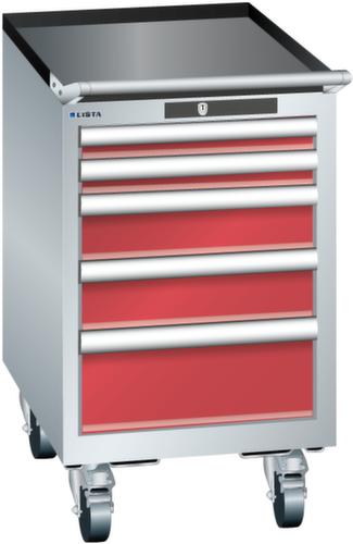 "longDescription": "LISTA Schubladenschrank mobil, Lista Einheit: 18x27E, BxTxH: 411x572x723mm, Schubladen-Nutzfläche BxT: 306x459mm, Anzahl Schubladen: 5, Anzahl Fronthöhen (Tragkraft): 2x50mm (75kg), 2x100mm (75kg), 1x150mm (75kg), Schliessart: Code Lock, elektronisches Zahlenschloss mit 10 Ziffern für 4- bis 6-stellige Codes, bis 100 Codes, Farbe Gehäuse: Lichtgrau RAL 7035, Farbe Schubladen: Rubinrot RAL 3003. Höchste Stabilität: Gehäuse bis 4t belastbar, Schubladen mit 75 oder 200 kg Tragkraft. Maximale Ausnutzung dank Vollauszug und optimaler Mantelhöhe der Schubladen. Exzellente Schutzeigenschaften gegen Schmutz, Flüssigkeiten und mechanische Beanspruchung durch geschlossenes Gehäuse mit schlag- und abriebfester Oberfläche. Überzeugende Sicherheit: Aushebesicherung gegen Herausfallen der Schubladen und Einzelschubladensperre als Kippschutz. Korrosionsschutz durch Elektrophorese-Tauchlackierung und umweltfreundlichen Pulverlack. Optimale Ordnung und Organisation dank speziellem LISTA-Einteilungsmaterial für jeden Zweck und gelochter, geschlitzter Schubladen. Professionelle Beschriftung mit Beschriftungssoftware LISTA Script und hochklappbarer Griffleiste zum Einlegen der Etiketten. Perfekte Laufruhe durch traversenlos geführten Differenzialauszug. Flexible Anpassungsmöglichkeiten durch vorperforierte Löcher für Tischplatten (Punchout), Rollen, Schubladen, Schliesssysteme für einfaches Um- und Nachrüsten<br>",