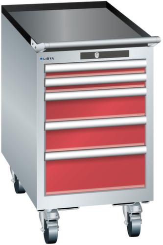 "longDescription": "LISTA Schubladenschrank mobil, Lista Einheit: 18x36E, BxTxH: 411x725x723mm, Schubladen-Nutzfläche BxT: 306x612mm, Anzahl Schubladen: 5, Anzahl Fronthöhen (Tragkraft): 2x50mm (75kg), 2x100mm (75kg), 1x150mm (75kg), Schliessart: Key Lock, Standard-Schliessung mit Wechselyzlinder inkl. 2 Schlüsseln mit Schlüsselnummer, Farbe Gehäuse: Lichtgrau RAL 7035, Farbe Schubladen: Rubinrot RAL 3003. Höchste Stabilität: Gehäuse bis 4t belastbar, Schubladen mit 75 oder 200 kg Tragkraft. Maximale Ausnutzung dank Vollauszug und optimaler Mantelhöhe der Schubladen. Exzellente Schutzeigenschaften gegen Schmutz, Flüssigkeiten und mechanische Beanspruchung durch geschlossenes Gehäuse mit schlag- und abriebfester Oberfläche. Überzeugende Sicherheit: Aushebesicherung gegen Herausfallen der Schubladen und Einzelschubladensperre als Kippschutz. Korrosionsschutz durch Elektrophorese-Tauchlackierung und umweltfreundlichen Pulverlack. Optimale Ordnung und Organisation dank speziellem LISTA-Einteilungsmaterial für jeden Zweck und gelochter, geschlitzter Schubladen. Professionelle Beschriftung mit Beschriftungssoftware LISTA Script und hochklappbarer Griffleiste zum Einlegen der Etiketten. Perfekte Laufruhe durch traversenlos geführten Differenzialauszug. Flexible Anpassungsmöglichkeiten durch vorperforierte Löcher für Tischplatten (Punchout), Rollen, Schubladen, Schliesssysteme für einfaches Um- und Nachrüsten<br>",