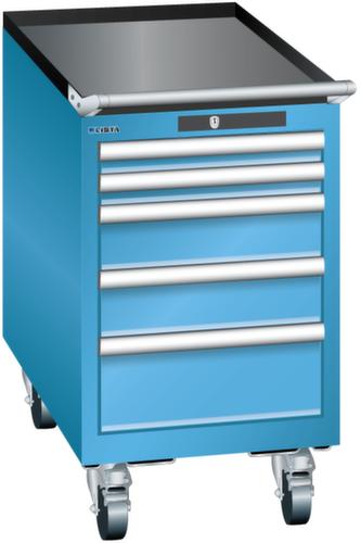 "longDescription": "LISTA Schubladenschrank mobil, Lista Einheit: 18x36E, BxTxH: 411x725x723mm, Schubladen-Nutzfläche BxT: 306x612mm, Anzahl Schubladen: 5, Anzahl Fronthöhen (Tragkraft): 2x50mm (75kg), 2x100mm (75kg), 1x150mm (75kg), Schliessart: Code Lock, elektronisches Zahlenschloss mit 10 Ziffern für 4- bis 6-stellige Codes, bis 100 Codes, Farbe Gehäuse: Lichtblau RAL 5012, Farbe Schubladen: Lichtblau RAL 5012. Höchste Stabilität: Gehäuse bis 4t belastbar, Schubladen mit 75 oder 200 kg Tragkraft. Maximale Ausnutzung dank Vollauszug und optimaler Mantelhöhe der Schubladen. Exzellente Schutzeigenschaften gegen Schmutz, Flüssigkeiten und mechanische Beanspruchung durch geschlossenes Gehäuse mit schlag- und abriebfester Oberfläche. Überzeugende Sicherheit: Aushebesicherung gegen Herausfallen der Schubladen und Einzelschubladensperre als Kippschutz. Korrosionsschutz durch Elektrophorese-Tauchlackierung und umweltfreundlichen Pulverlack. Optimale Ordnung und Organisation dank speziellem LISTA-Einteilungsmaterial für jeden Zweck und gelochter, geschlitzter Schubladen. Professionelle Beschriftung mit Beschriftungssoftware LISTA Script und hochklappbarer Griffleiste zum Einlegen der Etiketten. Perfekte Laufruhe durch traversenlos geführten Differenzialauszug. Flexible Anpassungsmöglichkeiten durch vorperforierte Löcher für Tischplatten (Punchout), Rollen, Schubladen, Schliesssysteme für einfaches Um- und Nachrüsten<br>",