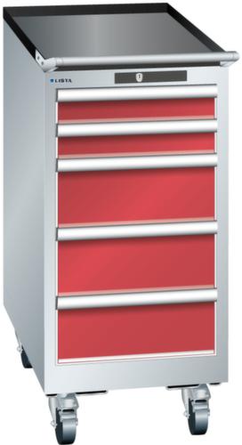 "longDescription": "LISTA Schubladenschrank mobil, Lista Einheit: 18x36E, BxTxH: 411x725x890mm, Schubladen-Nutzfläche BxT: 306x612mm, Anzahl Schubladen: 5, Anzahl Fronthöhen (Tragkraft): 2x75mm (75kg), 3x150mm (75kg), Schliessart: Key Lock, Standard-Schliessung mit Wechselyzlinder inkl. 2 Schlüsseln mit Schlüsselnummer, Farbe Gehäuse: Lichtgrau RAL 7035, Farbe Schubladen: Rubinrot RAL 3003. Höchste Stabilität: Gehäuse bis 4t belastbar, Schubladen mit 75 oder 200 kg Tragkraft. Maximale Ausnutzung dank Vollauszug und optimaler Mantelhöhe der Schubladen. Exzellente Schutzeigenschaften gegen Schmutz, Flüssigkeiten und mechanische Beanspruchung durch geschlossenes Gehäuse mit schlag- und abriebfester Oberfläche. Überzeugende Sicherheit: Aushebesicherung gegen Herausfallen der Schubladen und Einzelschubladensperre als Kippschutz. Korrosionsschutz durch Elektrophorese-Tauchlackierung und umweltfreundlichen Pulverlack. Optimale Ordnung und Organisation dank speziellem LISTA-Einteilungsmaterial für jeden Zweck und gelochter, geschlitzter Schubladen. Professionelle Beschriftung mit Beschriftungssoftware LISTA Script und hochklappbarer Griffleiste zum Einlegen der Etiketten. Perfekte Laufruhe durch traversenlos geführten Differenzialauszug. Flexible Anpassungsmöglichkeiten durch vorperforierte Löcher für Tischplatten (Punchout), Rollen, Schubladen, Schliesssysteme für einfaches Um- und Nachrüsten<br>",
