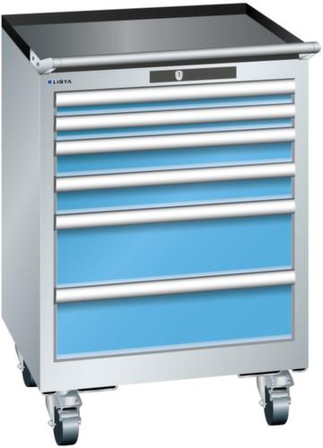 "longDescription": "LISTA Schubladenschrank mobil, Lista Einheit: 27x27E, BxTxH: 564x572x840mm, Schubladen-Nutzfläche BxT: 459x459mm, Anzahl Schubladen: 6, Anzahl Fronthöhen (Tragkraft): 2x50mm (75kg), 2x75mm (75kg), 2x150mm (75kg), Schliessart: Code Lock, elektronisches Zahlenschloss mit 10 Ziffern für 4- bis 6-stellige Codes, bis 100 Codes, Farbe Gehäuse: Lichtgrau RAL 7035, Farbe Schubladen: Lichtblau RAL 5012. Höchste Stabilität: Gehäuse bis 4t belastbar, Schubladen mit 75 oder 200 kg Tragkraft. Maximale Ausnutzung dank Vollauszug und optimaler Mantelhöhe der Schubladen. Exzellente Schutzeigenschaften gegen Schmutz, Flüssigkeiten und mechanische Beanspruchung durch geschlossenes Gehäuse mit schlag- und abriebfester Oberfläche. Überzeugende Sicherheit: Aushebesicherung gegen Herausfallen der Schubladen und Einzelschubladensperre als Kippschutz. Korrosionsschutz durch Elektrophorese-Tauchlackierung und umweltfreundlichen Pulverlack. Optimale Ordnung und Organisation dank speziellem LISTA-Einteilungsmaterial für jeden Zweck und gelochter, geschlitzter Schubladen. Professionelle Beschriftung mit Beschriftungssoftware LISTA Script und hochklappbarer Griffleiste zum Einlegen der Etiketten. Perfekte Laufruhe durch traversenlos geführten Differenzialauszug. Flexible Anpassungsmöglichkeiten durch vorperforierte Löcher für Tischplatten (Punchout), Rollen, Schubladen, Schliesssysteme für einfaches Um- und Nachrüsten<br>",