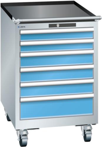 "longDescription": "LISTA Schubladenschrank mobil, Lista Einheit: 27x27E, BxTxH: 564x572x890mm, Schubladen-Nutzfläche BxT: 459x459mm, Anzahl Schubladen: 6, Anzahl Fronthöhen (Tragkraft): 2x 75mm (75kg), 3x100mm (75kg), 1x150mm (75kg), Schliessart: Key Lock, Standard-Schliessung mit Wechselyzlinder inkl. 2 Schlüsseln mit Schlüsselnummer, Farbe Gehäuse: Lichtgrau RAL 7035, Farbe Schubladen: Lichtblau RAL 5012. Höchste Stabilität: Gehäuse bis 4t belastbar, Schubladen mit 75 oder 200 kg Tragkraft. Maximale Ausnutzung dank Vollauszug und optimaler Mantelhöhe der Schubladen. Exzellente Schutzeigenschaften gegen Schmutz, Flüssigkeiten und mechanische Beanspruchung durch geschlossenes Gehäuse mit schlag- und abriebfester Oberfläche. Überzeugende Sicherheit: Aushebesicherung gegen Herausfallen der Schubladen und Einzelschubladensperre als Kippschutz. Korrosionsschutz durch Elektrophorese-Tauchlackierung und umweltfreundlichen Pulverlack. Optimale Ordnung und Organisation dank speziellem LISTA-Einteilungsmaterial für jeden Zweck und gelochter, geschlitzter Schubladen. Professionelle Beschriftung mit Beschriftungssoftware LISTA Script und hochklappbarer Griffleiste zum Einlegen der Etiketten. Perfekte Laufruhe durch traversenlos geführten Differenzialauszug. Flexible Anpassungsmöglichkeiten durch vorperforierte Löcher für Tischplatten (Punchout), Rollen, Schubladen, Schliesssysteme für einfaches Um- und Nachrüsten<br>",