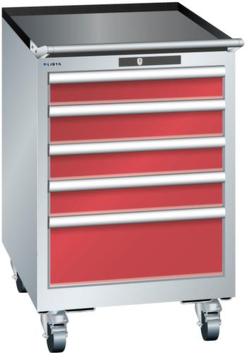 "longDescription": "LISTA Schubladenschrank mobil, Lista Einheit: 27x27E, BxTxH: 564x572x890mm, Schubladen-Nutzfläche BxT: 459x459mm, Anzahl Schubladen: 5, Anzahl Fronthöhen (Tragkraft): 4x100mm (75kg), 1x200mm (75kg), Schliessart: Key Lock, Standard-Schliessung mit Wechselyzlinder inkl. 2 Schlüsseln mit Schlüsselnummer, Farbe Gehäuse: Lichtgrau RAL 7035, Farbe Schubladen: Rubinrot RAL 3003. Höchste Stabilität: Gehäuse bis 4t belastbar, Schubladen mit 75 oder 200 kg Tragkraft. Maximale Ausnutzung dank Vollauszug und optimaler Mantelhöhe der Schubladen. Exzellente Schutzeigenschaften gegen Schmutz, Flüssigkeiten und mechanische Beanspruchung durch geschlossenes Gehäuse mit schlag- und abriebfester Oberfläche. Überzeugende Sicherheit: Aushebesicherung gegen Herausfallen der Schubladen und Einzelschubladensperre als Kippschutz. Korrosionsschutz durch Elektrophorese-Tauchlackierung und umweltfreundlichen Pulverlack. Optimale Ordnung und Organisation dank speziellem LISTA-Einteilungsmaterial für jeden Zweck und gelochter, geschlitzter Schubladen. Professionelle Beschriftung mit Beschriftungssoftware LISTA Script und hochklappbarer Griffleiste zum Einlegen der Etiketten. Perfekte Laufruhe durch traversenlos geführten Differenzialauszug. Flexible Anpassungsmöglichkeiten durch vorperforierte Löcher für Tischplatten (Punchout), Rollen, Schubladen, Schliesssysteme für einfaches Um- und Nachrüsten<br>",