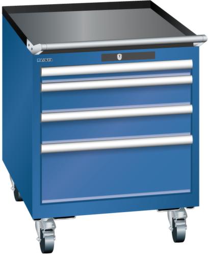 "longDescription": "LISTA Schubladenschrank mobil, Lista Einheit: 27x36E, BxTxH: 564x725x723mm, Schubladen-Nutzfläche BxT: 459x612mm, Anzahl Schubladen: 4, Anzahl Fronthöhen (Tragkraft): 1x 50mm (75kg), 2x100mm (75kg), 1x200mm (75kg), Schliessart: Code Lock, elektronisches Zahlenschloss mit 10 Ziffern für 4- bis 6-stellige Codes, bis 100 Codes, Farbe Gehäuse: Enzianblau RAL 5010, Farbe Schubladen: Enzianblau RAL 5010. Höchste Stabilität: Gehäuse bis 4t belastbar, Schubladen mit 75 oder 200 kg Tragkraft. Maximale Ausnutzung dank Vollauszug und optimaler Mantelhöhe der Schubladen. Exzellente Schutzeigenschaften gegen Schmutz, Flüssigkeiten und mechanische Beanspruchung durch geschlossenes Gehäuse mit schlag- und abriebfester Oberfläche. Überzeugende Sicherheit: Aushebesicherung gegen Herausfallen der Schubladen und Einzelschubladensperre als Kippschutz. Korrosionsschutz durch Elektrophorese-Tauchlackierung und umweltfreundlichen Pulverlack. Optimale Ordnung und Organisation dank speziellem LISTA-Einteilungsmaterial für jeden Zweck und gelochter, geschlitzter Schubladen. Professionelle Beschriftung mit Beschriftungssoftware LISTA Script und hochklappbarer Griffleiste zum Einlegen der Etiketten. Perfekte Laufruhe durch traversenlos geführten Differenzialauszug. Flexible Anpassungsmöglichkeiten durch vorperforierte Löcher für Tischplatten (Punchout), Rollen, Schubladen, Schliesssysteme für einfaches Um- und Nachrüsten<br>",