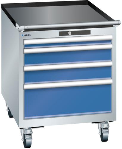 "longDescription": "LISTA Schubladenschrank mobil, Lista Einheit: 27x36E, BxTxH: 564x725x723mm, Schubladen-Nutzfläche BxT: 459x612mm, Anzahl Schubladen: 4, Anzahl Fronthöhen (Tragkraft): 1x 50mm (75kg), 2x100mm (75kg), 1x200mm (75kg), Schliessart: Code Lock, elektronisches Zahlenschloss mit 10 Ziffern für 4- bis 6-stellige Codes, bis 100 Codes, Farbe Gehäuse: Lichtgrau RAL 7035, Farbe Schubladen: Signalblau RAL 5005. Höchste Stabilität: Gehäuse bis 4t belastbar, Schubladen mit 75 oder 200 kg Tragkraft. Maximale Ausnutzung dank Vollauszug und optimaler Mantelhöhe der Schubladen. Exzellente Schutzeigenschaften gegen Schmutz, Flüssigkeiten und mechanische Beanspruchung durch geschlossenes Gehäuse mit schlag- und abriebfester Oberfläche. Überzeugende Sicherheit: Aushebesicherung gegen Herausfallen der Schubladen und Einzelschubladensperre als Kippschutz. Korrosionsschutz durch Elektrophorese-Tauchlackierung und umweltfreundlichen Pulverlack. Optimale Ordnung und Organisation dank speziellem LISTA-Einteilungsmaterial für jeden Zweck und gelochter, geschlitzter Schubladen. Professionelle Beschriftung mit Beschriftungssoftware LISTA Script und hochklappbarer Griffleiste zum Einlegen der Etiketten. Perfekte Laufruhe durch traversenlos geführten Differenzialauszug. Flexible Anpassungsmöglichkeiten durch vorperforierte Löcher für Tischplatten (Punchout), Rollen, Schubladen, Schliesssysteme für einfaches Um- und Nachrüsten<br>",