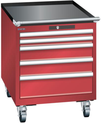 "longDescription": "LISTA Schubladenschrank mobil, Lista Einheit: 27x36E, BxTxH: 564x725x723mm, Schubladen-Nutzfläche BxT: 459x612mm, Anzahl Schubladen: 5, Anzahl Fronthöhen (Tragkraft): 2x 50mm (75kg), 2x100mm (75kg), 1x150mm (75kg), Schliessart: Code Lock, elektronisches Zahlenschloss mit 10 Ziffern für 4- bis 6-stellige Codes, bis 100 Codes, Farbe Gehäuse: Rubinrot RAL 3003, Farbe Schubladen: Rubinrot RAL 3003. Höchste Stabilität: Gehäuse bis 4t belastbar, Schubladen mit 75 oder 200 kg Tragkraft. Maximale Ausnutzung dank Vollauszug und optimaler Mantelhöhe der Schubladen. Exzellente Schutzeigenschaften gegen Schmutz, Flüssigkeiten und mechanische Beanspruchung durch geschlossenes Gehäuse mit schlag- und abriebfester Oberfläche. Überzeugende Sicherheit: Aushebesicherung gegen Herausfallen der Schubladen und Einzelschubladensperre als Kippschutz. Korrosionsschutz durch Elektrophorese-Tauchlackierung und umweltfreundlichen Pulverlack. Optimale Ordnung und Organisation dank speziellem LISTA-Einteilungsmaterial für jeden Zweck und gelochter, geschlitzter Schubladen. Professionelle Beschriftung mit Beschriftungssoftware LISTA Script und hochklappbarer Griffleiste zum Einlegen der Etiketten. Perfekte Laufruhe durch traversenlos geführten Differenzialauszug. Flexible Anpassungsmöglichkeiten durch vorperforierte Löcher für Tischplatten (Punchout), Rollen, Schubladen, Schliesssysteme für einfaches Um- und Nachrüsten<br>",