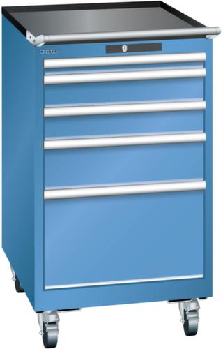"longDescription": "LISTA Schubladenschrank mobil, Lista Einheit: 27x36E, BxTxH: 564x725x990mm, Schubladen-Nutzfläche BxT: 459x612mm, Anzahl Schubladen: 5, Anzahl Fronthöhen (Tragkraft): 1x 50mm (75kg), 2x100mm (75kg), 1x150mm (75kg), 1x300mm (75kg), Schliessart: Key Lock, Standard-Schliessung mit Wechselyzlinder inkl. 2 Schlüsseln mit Schlüsselnummer, Farbe Gehäuse: Capriblau RAL 5019, Farbe Schubladen: Capriblau RAL 5019. Höchste Stabilität: Gehäuse bis 4t belastbar, Schubladen mit 75 oder 200 kg Tragkraft. Maximale Ausnutzung dank Vollauszug und optimaler Mantelhöhe der Schubladen. Exzellente Schutzeigenschaften gegen Schmutz, Flüssigkeiten und mechanische Beanspruchung durch geschlossenes Gehäuse mit schlag- und abriebfester Oberfläche. Überzeugende Sicherheit: Aushebesicherung gegen Herausfallen der Schubladen und Einzelschubladensperre als Kippschutz. Korrosionsschutz durch Elektrophorese-Tauchlackierung und umweltfreundlichen Pulverlack. Optimale Ordnung und Organisation dank speziellem LISTA-Einteilungsmaterial für jeden Zweck und gelochter, geschlitzter Schubladen. Professionelle Beschriftung mit Beschriftungssoftware LISTA Script und hochklappbarer Griffleiste zum Einlegen der Etiketten. Perfekte Laufruhe durch traversenlos geführten Differenzialauszug. Flexible Anpassungsmöglichkeiten durch vorperforierte Löcher für Tischplatten (Punchout), Rollen, Schubladen, Schliesssysteme für einfaches Um- und Nachrüsten<br>",