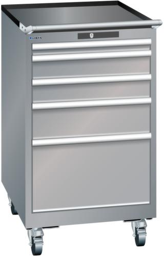 "longDescription": "LISTA Schubladenschrank mobil, Lista Einheit: 27x36E, BxTxH: 564x725x990mm, Schubladen-Nutzfläche BxT: 459x612mm, Anzahl Schubladen: 5, Anzahl Fronthöhen (Tragkraft): 1x 50mm (75kg), 2x100mm (75kg), 1x150mm (75kg), 1x300mm (75kg), Schliessart: Code Lock, elektronisches Zahlenschloss mit 10 Ziffern für 4- bis 6-stellige Codes, bis 100 Codes, Farbe Gehäuse: Taubengrau NCS S 4502-B, Farbe Schubladen: Taubengrau NCS S 4502-B. Höchste Stabilität: Gehäuse bis 4t belastbar, Schubladen mit 75 oder 200 kg Tragkraft. Maximale Ausnutzung dank Vollauszug und optimaler Mantelhöhe der Schubladen. Exzellente Schutzeigenschaften gegen Schmutz, Flüssigkeiten und mechanische Beanspruchung durch geschlossenes Gehäuse mit schlag- und abriebfester Oberfläche. Überzeugende Sicherheit: Aushebesicherung gegen Herausfallen der Schubladen und Einzelschubladensperre als Kippschutz. Korrosionsschutz durch Elektrophorese-Tauchlackierung und umweltfreundlichen Pulverlack. Optimale Ordnung und Organisation dank speziellem LISTA-Einteilungsmaterial für jeden Zweck und gelochter, geschlitzter Schubladen. Professionelle Beschriftung mit Beschriftungssoftware LISTA Script und hochklappbarer Griffleiste zum Einlegen der Etiketten. Perfekte Laufruhe durch traversenlos geführten Differenzialauszug. Flexible Anpassungsmöglichkeiten durch vorperforierte Löcher für Tischplatten (Punchout), Rollen, Schubladen, Schliesssysteme für einfaches Um- und Nachrüsten<br>",