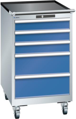 "longDescription": "LISTA Schubladenschrank mobil, Lista Einheit: 27x36E, BxTxH: 564x725x990mm, Schubladen-Nutzfläche BxT: 459x612mm, Anzahl Schubladen: 5, Anzahl Fronthöhen (Tragkraft): 3x100mm (75kg), 2x200mm (75kg), Schliessart: Code Lock, elektronisches Zahlenschloss mit 10 Ziffern für 4- bis 6-stellige Codes, bis 100 Codes, Farbe Gehäuse: Lichtgrau RAL 7035, Farbe Schubladen: Signalblau RAL 5005. Höchste Stabilität: Gehäuse bis 4t belastbar, Schubladen mit 75 oder 200 kg Tragkraft. Maximale Ausnutzung dank Vollauszug und optimaler Mantelhöhe der Schubladen. Exzellente Schutzeigenschaften gegen Schmutz, Flüssigkeiten und mechanische Beanspruchung durch geschlossenes Gehäuse mit schlag- und abriebfester Oberfläche. Überzeugende Sicherheit: Aushebesicherung gegen Herausfallen der Schubladen und Einzelschubladensperre als Kippschutz. Korrosionsschutz durch Elektrophorese-Tauchlackierung und umweltfreundlichen Pulverlack. Optimale Ordnung und Organisation dank speziellem LISTA-Einteilungsmaterial für jeden Zweck und gelochter, geschlitzter Schubladen. Professionelle Beschriftung mit Beschriftungssoftware LISTA Script und hochklappbarer Griffleiste zum Einlegen der Etiketten. Perfekte Laufruhe durch traversenlos geführten Differenzialauszug. Flexible Anpassungsmöglichkeiten durch vorperforierte Löcher für Tischplatten (Punchout), Rollen, Schubladen, Schliesssysteme für einfaches Um- und Nachrüsten<br>",