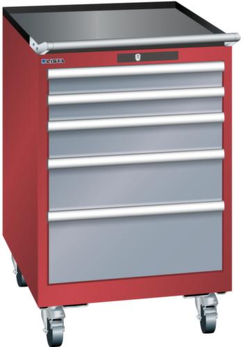 "longDescription": "LISTA Schubladenschrank mobil, Lista Einheit: 27x36E, BxTxH: 564x725x890mm, Schubladen-Nutzfläche BxT: 459x612mm, Anzahl Schubladen: 5, Anzahl Fronthöhen (Tragkraft): 2x75mm (75kg), 1x100mm (75kg), 1x150mm (75kg), 1x200mm (75kg), Schliessart: Key Lock, Standard-Schliessung mit Wechselyzlinder inkl. 2 Schlüsseln mit Schlüsselnummer, Farbe Gehäuse: Rubinrot RAL 3003, Farbe Schubladen: Grau metallic NCS S 6502-B. Höchste Stabilität: Gehäuse bis 4t belastbar, Schubladen mit 75 oder 200 kg Tragkraft. Maximale Ausnutzung dank Vollauszug und optimaler Mantelhöhe der Schubladen. Exzellente Schutzeigenschaften gegen Schmutz, Flüssigkeiten und mechanische Beanspruchung durch geschlossenes Gehäuse mit schlag- und abriebfester Oberfläche. Überzeugende Sicherheit: Aushebesicherung gegen Herausfallen der Schubladen und Einzelschubladensperre als Kippschutz. Korrosionsschutz durch Elektrophorese-Tauchlackierung und umweltfreundlichen Pulverlack. Optimale Ordnung und Organisation dank speziellem LISTA-Einteilungsmaterial für jeden Zweck und gelochter, geschlitzter Schubladen. Professionelle Beschriftung mit Beschriftungssoftware LISTA Script und hochklappbarer Griffleiste zum Einlegen der Etiketten. Perfekte Laufruhe durch traversenlos geführten Differenzialauszug. Flexible Anpassungsmöglichkeiten durch vorperforierte Löcher für Tischplatten (Punchout), Rollen, Schubladen, Schliesssysteme für einfaches Um- und Nachrüsten<br>",