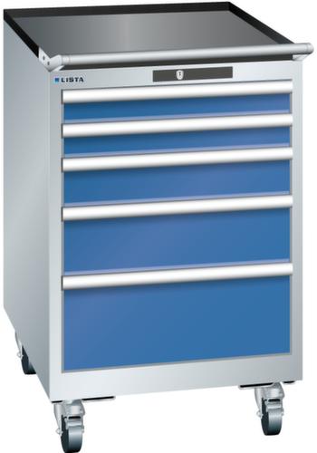 "longDescription": "LISTA Schubladenschrank mobil, Lista Einheit: 27x36E, BxTxH: 564x725x890mm, Schubladen-Nutzfläche BxT: 459x612mm, Anzahl Schubladen: 5, Anzahl Fronthöhen (Tragkraft): 2x75mm (75kg), 1x100mm (75kg), 1x150mm (75kg), 1x200mm (75kg), Schliessart: Code Lock, elektronisches Zahlenschloss mit 10 Ziffern für 4- bis 6-stellige Codes, bis 100 Codes, Farbe Gehäuse: Lichtgrau RAL 7035, Farbe Schubladen: Signalblau RAL 5005. Höchste Stabilität: Gehäuse bis 4t belastbar, Schubladen mit 75 oder 200 kg Tragkraft. Maximale Ausnutzung dank Vollauszug und optimaler Mantelhöhe der Schubladen. Exzellente Schutzeigenschaften gegen Schmutz, Flüssigkeiten und mechanische Beanspruchung durch geschlossenes Gehäuse mit schlag- und abriebfester Oberfläche. Überzeugende Sicherheit: Aushebesicherung gegen Herausfallen der Schubladen und Einzelschubladensperre als Kippschutz. Korrosionsschutz durch Elektrophorese-Tauchlackierung und umweltfreundlichen Pulverlack. Optimale Ordnung und Organisation dank speziellem LISTA-Einteilungsmaterial für jeden Zweck und gelochter, geschlitzter Schubladen. Professionelle Beschriftung mit Beschriftungssoftware LISTA Script und hochklappbarer Griffleiste zum Einlegen der Etiketten. Perfekte Laufruhe durch traversenlos geführten Differenzialauszug. Flexible Anpassungsmöglichkeiten durch vorperforierte Löcher für Tischplatten (Punchout), Rollen, Schubladen, Schliesssysteme für einfaches Um- und Nachrüsten<br>",