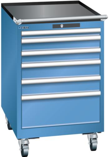 "longDescription": "LISTA Schubladenschrank mobil, Lista Einheit: 27x36E, BxTxH: 564x725x890mm, Schubladen-Nutzfläche BxT: 459x612mm, Anzahl Schubladen: 6, Anzahl Fronthöhen (Tragkraft): 1x50mm (75kg), 2x75mm (75kg), 2x100mm (75kg), 1x200mm (75kg), Schliessart: Key Lock, Standard-Schliessung mit Wechselyzlinder inkl. 2 Schlüsseln mit Schlüsselnummer, Farbe Gehäuse: Capriblau RAL 5019, Farbe Schubladen: Capriblau RAL 5019. Höchste Stabilität: Gehäuse bis 4t belastbar, Schubladen mit 75 oder 200 kg Tragkraft. Maximale Ausnutzung dank Vollauszug und optimaler Mantelhöhe der Schubladen. Exzellente Schutzeigenschaften gegen Schmutz, Flüssigkeiten und mechanische Beanspruchung durch geschlossenes Gehäuse mit schlag- und abriebfester Oberfläche. Überzeugende Sicherheit: Aushebesicherung gegen Herausfallen der Schubladen und Einzelschubladensperre als Kippschutz. Korrosionsschutz durch Elektrophorese-Tauchlackierung und umweltfreundlichen Pulverlack. Optimale Ordnung und Organisation dank speziellem LISTA-Einteilungsmaterial für jeden Zweck und gelochter, geschlitzter Schubladen. Professionelle Beschriftung mit Beschriftungssoftware LISTA Script und hochklappbarer Griffleiste zum Einlegen der Etiketten. Perfekte Laufruhe durch traversenlos geführten Differenzialauszug. Flexible Anpassungsmöglichkeiten durch vorperforierte Löcher für Tischplatten (Punchout), Rollen, Schubladen, Schliesssysteme für einfaches Um- und Nachrüsten<br>",