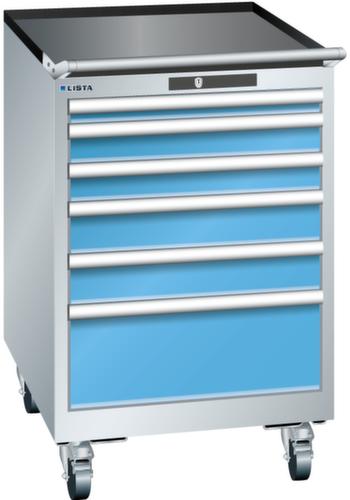 "longDescription": "LISTA Schubladenschrank mobil, Lista Einheit: 27x36E, BxTxH: 564x725x890mm, Schubladen-Nutzfläche BxT: 459x612mm, Anzahl Schubladen: 6, Anzahl Fronthöhen (Tragkraft): 1x50mm (75kg), 2x75mm (75kg), 2x100mm (75kg), 1x200mm (75kg), Schliessart: Key Lock, Standard-Schliessung mit Wechselyzlinder inkl. 2 Schlüsseln mit Schlüsselnummer, Farbe Gehäuse: Lichtgrau RAL 7035, Farbe Schubladen: Lichtblau RAL 5012. Höchste Stabilität: Gehäuse bis 4t belastbar, Schubladen mit 75 oder 200 kg Tragkraft. Maximale Ausnutzung dank Vollauszug und optimaler Mantelhöhe der Schubladen. Exzellente Schutzeigenschaften gegen Schmutz, Flüssigkeiten und mechanische Beanspruchung durch geschlossenes Gehäuse mit schlag- und abriebfester Oberfläche. Überzeugende Sicherheit: Aushebesicherung gegen Herausfallen der Schubladen und Einzelschubladensperre als Kippschutz. Korrosionsschutz durch Elektrophorese-Tauchlackierung und umweltfreundlichen Pulverlack. Optimale Ordnung und Organisation dank speziellem LISTA-Einteilungsmaterial für jeden Zweck und gelochter, geschlitzter Schubladen. Professionelle Beschriftung mit Beschriftungssoftware LISTA Script und hochklappbarer Griffleiste zum Einlegen der Etiketten. Perfekte Laufruhe durch traversenlos geführten Differenzialauszug. Flexible Anpassungsmöglichkeiten durch vorperforierte Löcher für Tischplatten (Punchout), Rollen, Schubladen, Schliesssysteme für einfaches Um- und Nachrüsten<br>",