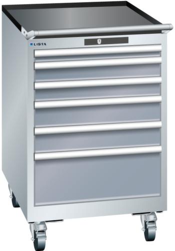 "longDescription": "LISTA Schubladenschrank mobil, Lista Einheit: 27x36E, BxTxH: 564x725x890mm, Schubladen-Nutzfläche BxT: 459x612mm, Anzahl Schubladen: 6, Anzahl Fronthöhen (Tragkraft): 1x50mm (75kg), 2x75mm (75kg), 2x100mm (75kg), 1x200mm (75kg), Schliessart: Key Lock, Standard-Schliessung mit Wechselyzlinder inkl. 2 Schlüsseln mit Schlüsselnummer, Farbe Gehäuse: Lichtgrau RAL 7035, Farbe Schubladen: Grau metallic NCS S 6502-B. Höchste Stabilität: Gehäuse bis 4t belastbar, Schubladen mit 75 oder 200 kg Tragkraft. Maximale Ausnutzung dank Vollauszug und optimaler Mantelhöhe der Schubladen. Exzellente Schutzeigenschaften gegen Schmutz, Flüssigkeiten und mechanische Beanspruchung durch geschlossenes Gehäuse mit schlag- und abriebfester Oberfläche. Überzeugende Sicherheit: Aushebesicherung gegen Herausfallen der Schubladen und Einzelschubladensperre als Kippschutz. Korrosionsschutz durch Elektrophorese-Tauchlackierung und umweltfreundlichen Pulverlack. Optimale Ordnung und Organisation dank speziellem LISTA-Einteilungsmaterial für jeden Zweck und gelochter, geschlitzter Schubladen. Professionelle Beschriftung mit Beschriftungssoftware LISTA Script und hochklappbarer Griffleiste zum Einlegen der Etiketten. Perfekte Laufruhe durch traversenlos geführten Differenzialauszug. Flexible Anpassungsmöglichkeiten durch vorperforierte Löcher für Tischplatten (Punchout), Rollen, Schubladen, Schliesssysteme für einfaches Um- und Nachrüsten<br>",