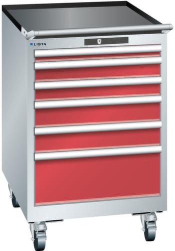 "longDescription": "LISTA Schubladenschrank mobil, Lista Einheit: 27x36E, BxTxH: 564x725x890mm, Schubladen-Nutzfläche BxT: 459x612mm, Anzahl Schubladen: 6, Anzahl Fronthöhen (Tragkraft): 1x50mm (75kg), 2x75mm (75kg), 2x100mm (75kg), 1x200mm (75kg), Schliessart: Code Lock, elektronisches Zahlenschloss mit 10 Ziffern für 4- bis 6-stellige Codes, bis 100 Codes, Farbe Gehäuse: Lichtgrau RAL 7035, Farbe Schubladen: Rubinrot RAL 3003. Höchste Stabilität: Gehäuse bis 4t belastbar, Schubladen mit 75 oder 200 kg Tragkraft. Maximale Ausnutzung dank Vollauszug und optimaler Mantelhöhe der Schubladen. Exzellente Schutzeigenschaften gegen Schmutz, Flüssigkeiten und mechanische Beanspruchung durch geschlossenes Gehäuse mit schlag- und abriebfester Oberfläche. Überzeugende Sicherheit: Aushebesicherung gegen Herausfallen der Schubladen und Einzelschubladensperre als Kippschutz. Korrosionsschutz durch Elektrophorese-Tauchlackierung und umweltfreundlichen Pulverlack. Optimale Ordnung und Organisation dank speziellem LISTA-Einteilungsmaterial für jeden Zweck und gelochter, geschlitzter Schubladen. Professionelle Beschriftung mit Beschriftungssoftware LISTA Script und hochklappbarer Griffleiste zum Einlegen der Etiketten. Perfekte Laufruhe durch traversenlos geführten Differenzialauszug. Flexible Anpassungsmöglichkeiten durch vorperforierte Löcher für Tischplatten (Punchout), Rollen, Schubladen, Schliesssysteme für einfaches Um- und Nachrüsten<br>",