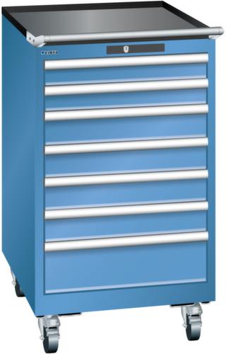 "longDescription": "LISTA Schubladenschrank mobil, Lista Einheit: 27x36E, BxTxH: 564x725x990mm, Schubladen-Nutzfläche BxT: 459x612mm, Anzahl Schubladen: 7, Anzahl Fronthöhen (Tragkraft): 2x 75mm (75kg), 4x100mm (75kg), 1x150mm (75kg), Schliessart: Code Lock, elektronisches Zahlenschloss mit 10 Ziffern für 4- bis 6-stellige Codes, bis 100 Codes, Farbe Gehäuse: Capriblau RAL 5019, Farbe Schubladen: Capriblau RAL 5019. Höchste Stabilität: Gehäuse bis 4t belastbar, Schubladen mit 75 oder 200 kg Tragkraft. Maximale Ausnutzung dank Vollauszug und optimaler Mantelhöhe der Schubladen. Exzellente Schutzeigenschaften gegen Schmutz, Flüssigkeiten und mechanische Beanspruchung durch geschlossenes Gehäuse mit schlag- und abriebfester Oberfläche. Überzeugende Sicherheit: Aushebesicherung gegen Herausfallen der Schubladen und Einzelschubladensperre als Kippschutz. Korrosionsschutz durch Elektrophorese-Tauchlackierung und umweltfreundlichen Pulverlack. Optimale Ordnung und Organisation dank speziellem LISTA-Einteilungsmaterial für jeden Zweck und gelochter, geschlitzter Schubladen. Professionelle Beschriftung mit Beschriftungssoftware LISTA Script und hochklappbarer Griffleiste zum Einlegen der Etiketten. Perfekte Laufruhe durch traversenlos geführten Differenzialauszug. Flexible Anpassungsmöglichkeiten durch vorperforierte Löcher für Tischplatten (Punchout), Rollen, Schubladen, Schliesssysteme für einfaches Um- und Nachrüsten<br>",