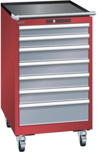 "longDescription": "LISTA Schubladenschrank mobil, Lista Einheit: 27x36E, BxTxH: 564x725x990mm, Schubladen-Nutzfläche BxT: 459x612mm, Anzahl Schubladen: 7, Anzahl Fronthöhen (Tragkraft): 2x 75mm (75kg), 4x100mm (75kg), 1x150mm (75kg), Schliessart: Code Lock, elektronisches Zahlenschloss mit 10 Ziffern für 4- bis 6-stellige Codes, bis 100 Codes, Farbe Gehäuse: Rubinrot RAL 3003, Farbe Schubladen: Grau metallic NCS S 6502-B. Höchste Stabilität: Gehäuse bis 4t belastbar, Schubladen mit 75 oder 200 kg Tragkraft. Maximale Ausnutzung dank Vollauszug und optimaler Mantelhöhe der Schubladen. Exzellente Schutzeigenschaften gegen Schmutz, Flüssigkeiten und mechanische Beanspruchung durch geschlossenes Gehäuse mit schlag- und abriebfester Oberfläche. Überzeugende Sicherheit: Aushebesicherung gegen Herausfallen der Schubladen und Einzelschubladensperre als Kippschutz. Korrosionsschutz durch Elektrophorese-Tauchlackierung und umweltfreundlichen Pulverlack. Optimale Ordnung und Organisation dank speziellem LISTA-Einteilungsmaterial für jeden Zweck und gelochter, geschlitzter Schubladen. Professionelle Beschriftung mit Beschriftungssoftware LISTA Script und hochklappbarer Griffleiste zum Einlegen der Etiketten. Perfekte Laufruhe durch traversenlos geführten Differenzialauszug. Flexible Anpassungsmöglichkeiten durch vorperforierte Löcher für Tischplatten (Punchout), Rollen, Schubladen, Schliesssysteme für einfaches Um- und Nachrüsten<br>",