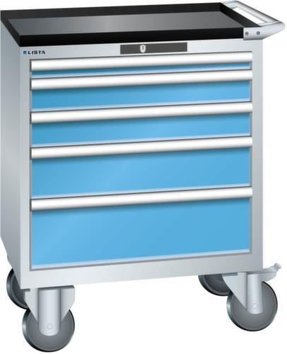"longDescription": "LISTA Schubladenschrank mobil, Lista Einheit: 36x27E, BxTxH: 717x572x962mm, Schubladen-Nutzfläche BxT: 612x459mm, Anzahl Schubladen: 5, Anzahl Fronthöhen (Tragkraft): 1x50mm (75kg), 2x100mm (75kg), 1x150mm (75kg), 1x200mm (75kg), Schliessart: Key Lock, Standard-Schliessung mit Wechselyzlinder inkl. 2 Schlüsseln mit Schlüsselnummer, Farbe Gehäuse: Lichtgrau RAL 7035, Farbe Schubladen: Lichtblau RAL 5012. Höchste Stabilität: Gehäuse bis 4t belastbar, Schubladen mit 75 oder 200 kg Tragkraft. Maximale Ausnutzung dank Vollauszug und optimaler Mantelhöhe der Schubladen. Exzellente Schutzeigenschaften gegen Schmutz, Flüssigkeiten und mechanische Beanspruchung durch geschlossenes Gehäuse mit schlag- und abriebfester Oberfläche. Überzeugende Sicherheit: Aushebesicherung gegen Herausfallen der Schubladen und Einzelschubladensperre als Kippschutz. Korrosionsschutz durch Elektrophorese-Tauchlackierung und umweltfreundlichen Pulverlack. Optimale Ordnung und Organisation dank speziellem LISTA-Einteilungsmaterial für jeden Zweck und gelochter, geschlitzter Schubladen. Professionelle Beschriftung mit Beschriftungssoftware LISTA Script und hochklappbarer Griffleiste zum Einlegen der Etiketten. Perfekte Laufruhe durch traversenlos geführten Differenzialauszug. Flexible Anpassungsmöglichkeiten durch vorperforierte Löcher für Tischplatten (Punchout), Rollen, Schubladen, Schliesssysteme für einfaches Um- und Nachrüsten<br>",