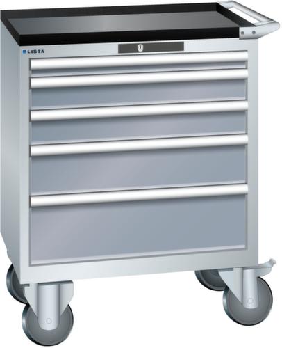 "longDescription": "LISTA Schubladenschrank mobil, Lista Einheit: 36x27E, BxTxH: 717x572x962mm, Schubladen-Nutzfläche BxT: 612x459mm, Anzahl Schubladen: 5, Anzahl Fronthöhen (Tragkraft): 1x50mm (75kg), 2x100mm (75kg), 1x150mm (75kg), 1x200mm (75kg), Schliessart: Code Lock, elektronisches Zahlenschloss mit 10 Ziffern für 4- bis 6-stellige Codes, bis 100 Codes, Farbe Gehäuse: Lichtgrau RAL 7035, Farbe Schubladen: Grau metallic NCS S 6502-B. Höchste Stabilität: Gehäuse bis 4t belastbar, Schubladen mit 75 oder 200 kg Tragkraft. Maximale Ausnutzung dank Vollauszug und optimaler Mantelhöhe der Schubladen. Exzellente Schutzeigenschaften gegen Schmutz, Flüssigkeiten und mechanische Beanspruchung durch geschlossenes Gehäuse mit schlag- und abriebfester Oberfläche. Überzeugende Sicherheit: Aushebesicherung gegen Herausfallen der Schubladen und Einzelschubladensperre als Kippschutz. Korrosionsschutz durch Elektrophorese-Tauchlackierung und umweltfreundlichen Pulverlack. Optimale Ordnung und Organisation dank speziellem LISTA-Einteilungsmaterial für jeden Zweck und gelochter, geschlitzter Schubladen. Professionelle Beschriftung mit Beschriftungssoftware LISTA Script und hochklappbarer Griffleiste zum Einlegen der Etiketten. Perfekte Laufruhe durch traversenlos geführten Differenzialauszug. Flexible Anpassungsmöglichkeiten durch vorperforierte Löcher für Tischplatten (Punchout), Rollen, Schubladen, Schliesssysteme für einfaches Um- und Nachrüsten<br>",