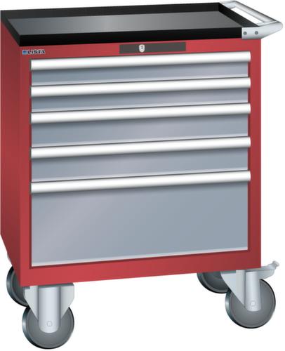 "longDescription": "LISTA Schubladenschrank mobil, Lista Einheit: 36x27E, BxTxH: 717x572x962mm, Schubladen-Nutzfläche BxT: 612x459mm, Anzahl Schubladen: 5, Anzahl Fronthöhen (Tragkraft): 2x75mm (75kg), 2x100mm (75kg), 1x250mm (75kg), Schliessart: Key Lock, Standard-Schliessung mit Wechselyzlinder inkl. 2 Schlüsseln mit Schlüsselnummer, Farbe Gehäuse: Rubinrot RAL 3003, Farbe Schubladen: Grau metallic NCS S 6502-B. Höchste Stabilität: Gehäuse bis 4t belastbar, Schubladen mit 75 oder 200 kg Tragkraft. Maximale Ausnutzung dank Vollauszug und optimaler Mantelhöhe der Schubladen. Exzellente Schutzeigenschaften gegen Schmutz, Flüssigkeiten und mechanische Beanspruchung durch geschlossenes Gehäuse mit schlag- und abriebfester Oberfläche. Überzeugende Sicherheit: Aushebesicherung gegen Herausfallen der Schubladen und Einzelschubladensperre als Kippschutz. Korrosionsschutz durch Elektrophorese-Tauchlackierung und umweltfreundlichen Pulverlack. Optimale Ordnung und Organisation dank speziellem LISTA-Einteilungsmaterial für jeden Zweck und gelochter, geschlitzter Schubladen. Professionelle Beschriftung mit Beschriftungssoftware LISTA Script und hochklappbarer Griffleiste zum Einlegen der Etiketten. Perfekte Laufruhe durch traversenlos geführten Differenzialauszug. Flexible Anpassungsmöglichkeiten durch vorperforierte Löcher für Tischplatten (Punchout), Rollen, Schubladen, Schliesssysteme für einfaches Um- und Nachrüsten<br>",