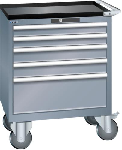 "longDescription": "LISTA Schubladenschrank mobil, Lista Einheit: 36x27E, BxTxH: 717x572x962mm, Schubladen-Nutzfläche BxT: 612x459mm, Anzahl Schubladen: 5, Anzahl Fronthöhen (Tragkraft): 2x75mm (75kg), 2x100mm (75kg), 1x250mm (75kg), Schliessart: Code Lock, elektronisches Zahlenschloss mit 10 Ziffern für 4- bis 6-stellige Codes, bis 100 Codes, Farbe Gehäuse: Grau metallic NCS S 6502-B, Farbe Schubladen: Grau metallic NCS S 6502-B. Höchste Stabilität: Gehäuse bis 4t belastbar, Schubladen mit 75 oder 200 kg Tragkraft. Maximale Ausnutzung dank Vollauszug und optimaler Mantelhöhe der Schubladen. Exzellente Schutzeigenschaften gegen Schmutz, Flüssigkeiten und mechanische Beanspruchung durch geschlossenes Gehäuse mit schlag- und abriebfester Oberfläche. Überzeugende Sicherheit: Aushebesicherung gegen Herausfallen der Schubladen und Einzelschubladensperre als Kippschutz. Korrosionsschutz durch Elektrophorese-Tauchlackierung und umweltfreundlichen Pulverlack. Optimale Ordnung und Organisation dank speziellem LISTA-Einteilungsmaterial für jeden Zweck und gelochter, geschlitzter Schubladen. Professionelle Beschriftung mit Beschriftungssoftware LISTA Script und hochklappbarer Griffleiste zum Einlegen der Etiketten. Perfekte Laufruhe durch traversenlos geführten Differenzialauszug. Flexible Anpassungsmöglichkeiten durch vorperforierte Löcher für Tischplatten (Punchout), Rollen, Schubladen, Schliesssysteme für einfaches Um- und Nachrüsten<br>",