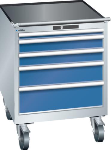 "longDescription": "LISTA Schubladenschrank mobil, Lista Einheit: 36x36E, BxTxH: 717x725x962mm, Schubladen-Nutzfläche BxT: 612x612mm, Anzahl Schubladen: 5, Anzahl Fronthöhen (Tragkraft): 1x50mm (75kg), 2x100mm (75kg), 1x150mm (75kg), 1x200mm (75kg), Schliessart: Key Lock, Standard-Schliessung mit Wechselyzlinder inkl. 2 Schlüsseln mit Schlüsselnummer, Farbe Gehäuse: Lichtgrau RAL 7035, Farbe Schubladen: Signalblau RAL 5005. Höchste Stabilität: Gehäuse bis 4t belastbar, Schubladen mit 75 oder 200 kg Tragkraft. Maximale Ausnutzung dank Vollauszug und optimaler Mantelhöhe der Schubladen. Exzellente Schutzeigenschaften gegen Schmutz, Flüssigkeiten und mechanische Beanspruchung durch geschlossenes Gehäuse mit schlag- und abriebfester Oberfläche. Überzeugende Sicherheit: Aushebesicherung gegen Herausfallen der Schubladen und Einzelschubladensperre als Kippschutz. Korrosionsschutz durch Elektrophorese-Tauchlackierung und umweltfreundlichen Pulverlack. Optimale Ordnung und Organisation dank speziellem LISTA-Einteilungsmaterial für jeden Zweck und gelochter, geschlitzter Schubladen. Professionelle Beschriftung mit Beschriftungssoftware LISTA Script und hochklappbarer Griffleiste zum Einlegen der Etiketten. Perfekte Laufruhe durch traversenlos geführten Differenzialauszug. Flexible Anpassungsmöglichkeiten durch vorperforierte Löcher für Tischplatten (Punchout), Rollen, Schubladen, Schliesssysteme für einfaches Um- und Nachrüsten<br>",