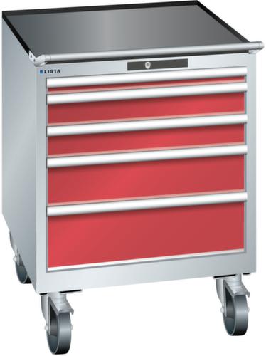 "longDescription": "LISTA Schubladenschrank mobil, Lista Einheit: 36x36E, BxTxH: 717x725x962mm, Schubladen-Nutzfläche BxT: 612x612mm, Anzahl Schubladen: 5, Anzahl Fronthöhen (Tragkraft): 1x50mm (75kg), 2x100mm (75kg), 1x150mm (75kg), 1x200mm (75kg), Schliessart: Key Lock, Standard-Schliessung mit Wechselyzlinder inkl. 2 Schlüsseln mit Schlüsselnummer, Farbe Gehäuse: Lichtgrau RAL 7035, Farbe Schubladen: Rubinrot RAL 3003. Höchste Stabilität: Gehäuse bis 4t belastbar, Schubladen mit 75 oder 200 kg Tragkraft. Maximale Ausnutzung dank Vollauszug und optimaler Mantelhöhe der Schubladen. Exzellente Schutzeigenschaften gegen Schmutz, Flüssigkeiten und mechanische Beanspruchung durch geschlossenes Gehäuse mit schlag- und abriebfester Oberfläche. Überzeugende Sicherheit: Aushebesicherung gegen Herausfallen der Schubladen und Einzelschubladensperre als Kippschutz. Korrosionsschutz durch Elektrophorese-Tauchlackierung und umweltfreundlichen Pulverlack. Optimale Ordnung und Organisation dank speziellem LISTA-Einteilungsmaterial für jeden Zweck und gelochter, geschlitzter Schubladen. Professionelle Beschriftung mit Beschriftungssoftware LISTA Script und hochklappbarer Griffleiste zum Einlegen der Etiketten. Perfekte Laufruhe durch traversenlos geführten Differenzialauszug. Flexible Anpassungsmöglichkeiten durch vorperforierte Löcher für Tischplatten (Punchout), Rollen, Schubladen, Schliesssysteme für einfaches Um- und Nachrüsten<br>",