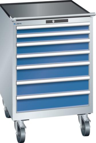 "longDescription": "LISTA Schubladenschrank mobil, Lista Einheit: 36x36E, BxTxH: 717x725x1112mm, Schubladen-Nutzfläche BxT: 612x612mm, Anzahl Schubladen: 7, Anzahl Fronthöhen (Tragkraft): 2x75mm (75kg), 2x100mm (75kg), 2x125mm (75kg), 1x150mm (75kg), Schliessart: Key Lock, Standard-Schliessung mit Wechselyzlinder inkl. 2 Schlüsseln mit Schlüsselnummer, Farbe Gehäuse: Lichtgrau RAL 7035, Farbe Schubladen: Signalblau RAL 5005. Höchste Stabilität: Gehäuse bis 4t belastbar, Schubladen mit 75 oder 200 kg Tragkraft. Maximale Ausnutzung dank Vollauszug und optimaler Mantelhöhe der Schubladen. Exzellente Schutzeigenschaften gegen Schmutz, Flüssigkeiten und mechanische Beanspruchung durch geschlossenes Gehäuse mit schlag- und abriebfester Oberfläche. Überzeugende Sicherheit: Aushebesicherung gegen Herausfallen der Schubladen und Einzelschubladensperre als Kippschutz. Korrosionsschutz durch Elektrophorese-Tauchlackierung und umweltfreundlichen Pulverlack. Optimale Ordnung und Organisation dank speziellem LISTA-Einteilungsmaterial für jeden Zweck und gelochter, geschlitzter Schubladen. Professionelle Beschriftung mit Beschriftungssoftware LISTA Script und hochklappbarer Griffleiste zum Einlegen der Etiketten. Perfekte Laufruhe durch traversenlos geführten Differenzialauszug. Flexible Anpassungsmöglichkeiten durch vorperforierte Löcher für Tischplatten (Punchout), Rollen, Schubladen, Schliesssysteme für einfaches Um- und Nachrüsten<br>",