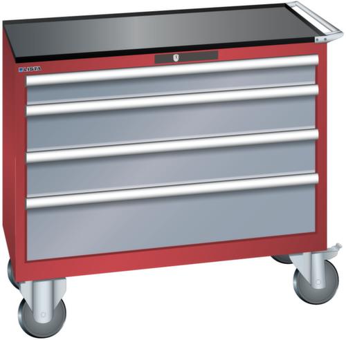 "longDescription": "LISTA Schubladenschrank mobil, Lista Einheit: 54x27E, BxTxH: 1023x572x962mm, Schubladen-Nutzfläche BxT: 918x459mm, Anzahl Schubladen: 4, Anzahl Fronthöhen (Tragkraft): 1x100mm (75kg), 2x150mm (75kg), 1x200mm (75kg), Schliessart: Key Lock, Standard-Schliessung mit Wechselyzlinder inkl. 2 Schlüsseln mit Schlüsselnummer, Farbe Gehäuse: Rubinrot RAL 3003, Farbe Schubladen: Grau metallic NCS S 6502-B. Höchste Stabilität: Gehäuse bis 4t belastbar, Schubladen mit 75 oder 200 kg Tragkraft. Maximale Ausnutzung dank Vollauszug und optimaler Mantelhöhe der Schubladen. Exzellente Schutzeigenschaften gegen Schmutz, Flüssigkeiten und mechanische Beanspruchung durch geschlossenes Gehäuse mit schlag- und abriebfester Oberfläche. Überzeugende Sicherheit: Aushebesicherung gegen Herausfallen der Schubladen und Einzelschubladensperre als Kippschutz. Korrosionsschutz durch Elektrophorese-Tauchlackierung und umweltfreundlichen Pulverlack. Optimale Ordnung und Organisation dank speziellem LISTA-Einteilungsmaterial für jeden Zweck und gelochter, geschlitzter Schubladen. Professionelle Beschriftung mit Beschriftungssoftware LISTA Script und hochklappbarer Griffleiste zum Einlegen der Etiketten. Perfekte Laufruhe durch traversenlos geführten Differenzialauszug. Flexible Anpassungsmöglichkeiten durch vorperforierte Löcher für Tischplatten (Punchout), Rollen, Schubladen, Schliesssysteme für einfaches Um- und Nachrüsten<br>",