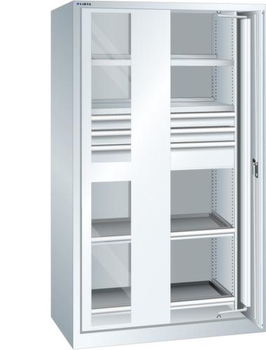 "longDescription": "LISTA Schwerlastschrank, Lista Einheit: 54x27E, BxTxH: 1146x690x1950mm, Anzahl Verstellböden: 2 (160kg), 33mm stark, verzinkt, Anzahl Schubladen: 2x75mm (200kg), 1x150mm (200kg), Schubladen-Nutzfläche BxT: 918x459mm, Anzahl Auszugböden: 2 (200kg), Schliessart: Key Lock, Standard-Schliessung mit Wechselzylinder inkl. 2 Schlüsseln mit Schlüsselnummer, Türlagerung: Sichtfenster-Einschwenktüren mit Scharnierbügel, Schwenkbereich 90 Grad, Farbe Gehäuse: Reinweiss RAL 9010, Farbe Türen: Reinweiss RAL 9010, Farbe Schubladen/Auszugböden: Grau NCS S 4502-B. Höchste Stabilität durch eine Gehäusetragkraft bis 1500 kg. Hohe Traglasten: 160 kg pro Verstellboden, 200 kg pro Schublade/Auszugbogen. Überzeugende Sicherheit durch Einzelschubladensperre gegen Kippgefahr bei Schwerlastschränken mit Einschwenktüren. Höchster Bedienkomfort durch schnellen Zugriff auf das gesamte Lagergut insbesondere bei einschwenkbaren Türen und leichtgängigen Rollladen mit bedienerfreundlichem Schiebegriff. Sichere Verschliessbarkeit mit Einschwenktüren, Flügeltüren oder Rollladen und intelligenten Schliesssystemen. Exzellente Schutzeigenschaften gegen Schmutz, Flüssigkeiten und mechanische Beanspruchung durch geschlossenes Gehäuse mit schlag- und abriebfester Oberfläche. Jederzeit anpassbar an neues Lagergut durch den flexiblen Ein- und Umbau von Schubladen, Auszugböden und Verstellböden im 25-mm-Raster. Volle Kompatibilität mit LISTA-Schubladenschränken und Schubladenregalen durch einheitliches Mass<br>",