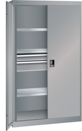 "longDescription": "LISTA Schwerlastschrank, Lista Einheit: 54x27E, BxTxH: 1100x641x1950mm, Anzahl Verstellböden: 3 (160kg), 35mm stark, verzinkt, Anzahl Schubladen: 1x100mm (200kg), 1x150mm (200kg), Schubladen-Nutzfläche BxT: 918x459mm, Schliessart: Key Lock, Standard-Schliessung mit Wechselzylinder inkl. 2 Schlüsseln mit Schlüsselnummer, Türlagerung: Vollblech-Flügeltüren mit Drehbolzenlagerung, Öffnungswinkel ca. 115 Grad, Farbe Gehäuse: Taubengrau NCS S 4502-B, Farbe Türen: Taubengrau NCS S 4502-B, Farbe Schubladen: Grau NCS S 4502-B. Höchste Stabilität durch eine Gehäusetragkraft bis 1500 kg. Hohe Traglasten: 160 kg pro Verstellboden, 200 kg pro Schublade/Auszugbogen. Überzeugende Sicherheit durch Einzelschubladensperre gegen Kippgefahr bei Schwerlastschränken mit Einschwenktüren. Höchster Bedienkomfort durch schnellen Zugriff auf das gesamte Lagergut insbesondere bei einschwenkbaren Türen und leichtgängigen Rollladen mit bedienerfreundlichem Schiebegriff. Sichere Verschliessbarkeit mit Einschwenktüren, Flügeltüren oder Rollladen und intelligenten Schliesssystemen. Exzellente Schutzeigenschaften gegen Schmutz, Flüssigkeiten und mechanische Beanspruchung durch geschlossenes Gehäuse mit schlag- und abriebfester Oberfläche. Jederzeit anpassbar an neues Lagergut durch den flexiblen Ein- und Umbau von Schubladen, Auszugböden und Verstellböden im 25-mm-Raster. Volle Kompatibilität mit LISTA-Schubladenschränken und Schubladenregalen durch einheitliches Mass<br>",
