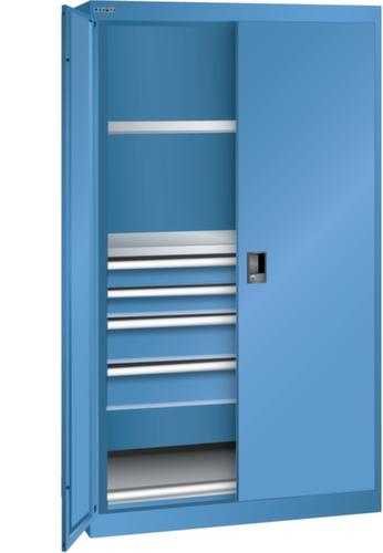 "longDescription": "LISTA Schwerlastschrank, Lista Einheit: 54x27E, BxTxH: 1100x641x1950mm, Anzahl Verstellböden: 2 (160kg), 35mm stark, verzinkt, Anzahl Schubladen: 2x100mm (200kg), 2x150mm (200kg), Schubladen-Nutzfläche BxT: 918x459mm, Anzahl Auszugböden: 1 (200kg), Schliessart: Code Lock, elektronisches Zahlenschloss mit 10 Ziffern für 4- bis 6-stellige Codes, bis 100 Codes, Türlagerung: Vollblech-Flügeltüren mit Drehbolzenlagerung, Öffnungswinkel ca. 115 Grad, Farbe Gehäuse: Capriblau RAL 5019, Farbe Türen: Capriblau RAL 5019, Farbe Schubladen/Auszugböden: Grau NCS S 4502-B. Höchste Stabilität durch eine Gehäusetragkraft bis 1500 kg. Hohe Traglasten: 160 kg pro Verstellboden, 200 kg pro Schublade/Auszugbogen. Überzeugende Sicherheit durch Einzelschubladensperre gegen Kippgefahr bei Schwerlastschränken mit Einschwenktüren. Höchster Bedienkomfort durch schnellen Zugriff auf das gesamte Lagergut insbesondere bei einschwenkbaren Türen und leichtgängigen Rollladen mit bedienerfreundlichem Schiebegriff. Sichere Verschliessbarkeit mit Einschwenktüren, Flügeltüren oder Rollladen und intelligenten Schliesssystemen. Exzellente Schutzeigenschaften gegen Schmutz, Flüssigkeiten und mechanische Beanspruchung durch geschlossenes Gehäuse mit schlag- und abriebfester Oberfläche. Jederzeit anpassbar an neues Lagergut durch den flexiblen Ein- und Umbau von Schubladen, Auszugböden und Verstellböden im 25-mm-Raster. Volle Kompatibilität mit LISTA-Schubladenschränken und Schubladenregalen durch einheitliches Mass<br>",