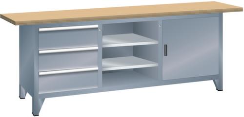 "longDescription": "LISTA Systemwerkbank, BxTxH: 2000x700x840mm, Material: Multiplex, 40mm stark, Max. Belastung: 1000kg, Anzahl Schubladen: 6, Anzahl Fronthöhen (Tragkraft): 6x150mm (70kg), Schubladen-Nutzfläche BxT: 459x510mm, Fächer mit Türen: 2x450mm, Anzahl Fachböden: 2 (50kg), Schliessart: Key Lock, Standard-Schliessung mit Wechselzylinder inkl. 2 Schlüsseln mit Schlüsselnummer, Farbe Gehäuse: Lichtgrau RAL 7035, Farbe Schubladen/Türen: Grau metallic NCS S 6502-B. Höchste Stabilität: Gehäuse bis 1,0 t belastbar, kraftschlüssige Steck- und Schraubverbindungen. Platzsparende und übersichtliche Lagerung in variablen Unterbauten mit leichtgängigen Schubladen mit bis zu 70 kg Tragkraft und vielfältigem Einteilungsmaterial. Sichere Verschliessbarkeit mit Schliesssystem Key Lock zur gleichzeitigen Sicherung aller Schubladen und Türen vor ungewolltem Zugriff<br>",